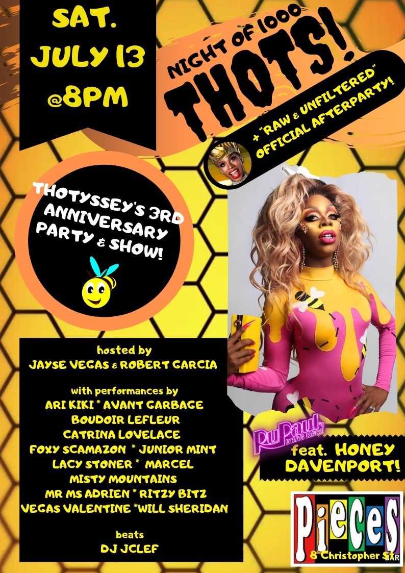 SATURDAY (7.13..2019): It’s finally time for NIGHT OF !000 THOTS, Thotyssey’s anniversary which this year is also Honey Davenport’s Beechman show afterparty… see tons of your favorite nightlife performers on the stage at Pieces! UPTOWN / BRONX CROTONA PARK: Bronx Pride (11am-7pm) BOXERS WH: DJ Nesto feat. Egypt (10pm) SUITE: Octavia Anyae (11:30pm) WEST END: TBAContinueContinue reading “Saturday (7.13.2019)”
