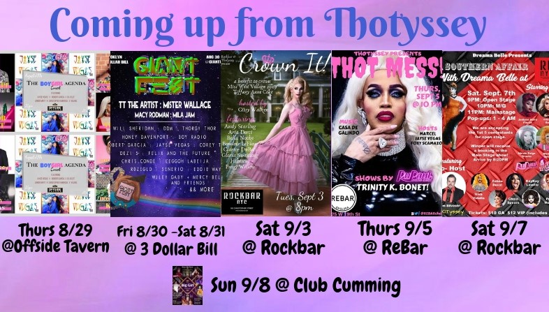 In addition to listing everyone’s events in NYC nightlife each night and interviewing key people in the biz, Thotyssey also powers and participates in events all over town! These next few weeks will be a particularly prolific stretch for us, so let’s break down our itinerary. “The BoyGirl Agenda” @ Offside Tavern (Thurs 8/29, 10pm)ContinueContinue reading “Where To Find Thotyssey!”
