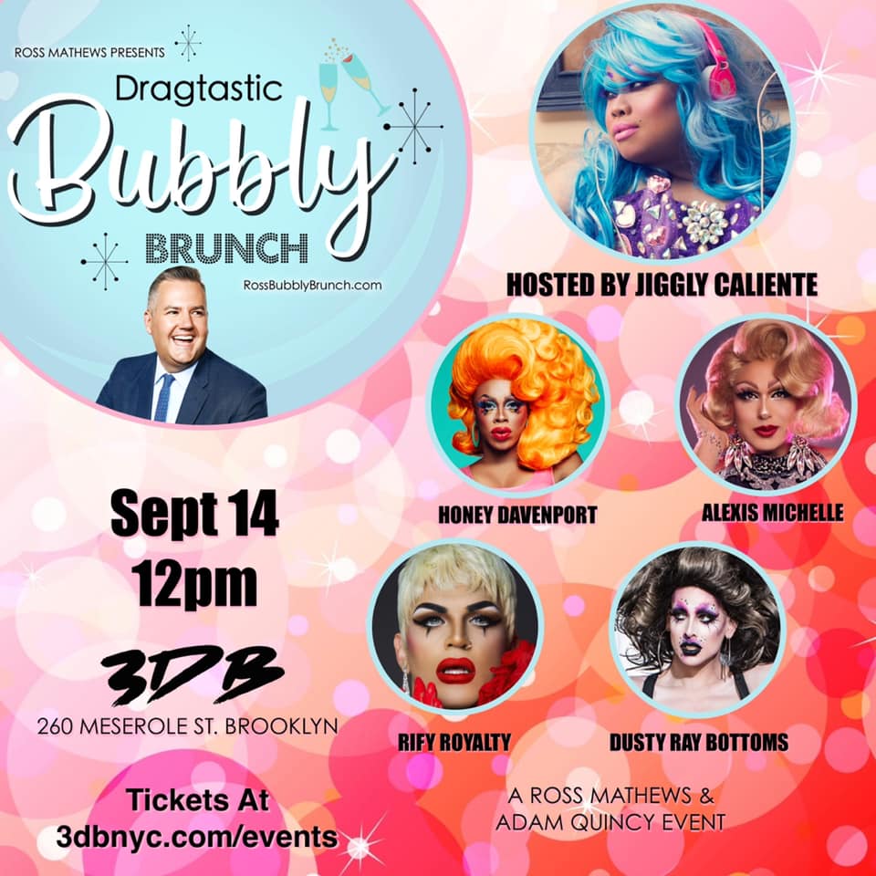 Your guide to the weekend’s queerest brunches and early events. SATURDAY 3 DOLLAR BILL: Brunch with Ross Matthews, Jiggly Caliente, Honey Davenport, Alexis Michelle, Rify Royalty & Dusty Ray Bottoms BOXERS HK : Brunch CAFETERIA (Chelsea): Brunch DE CAPO (Up): Brunch with Bootsie LeFaris DEEP END (Ridgewood Qns) Brunch with Tiffany Jones Sterling, with DJ P_A_T DOYLERS 37 (Chelsea): Brunch with Jacklynn HydeContinueContinue reading “Wake Up, Bitch! (9.14-15.2019)”