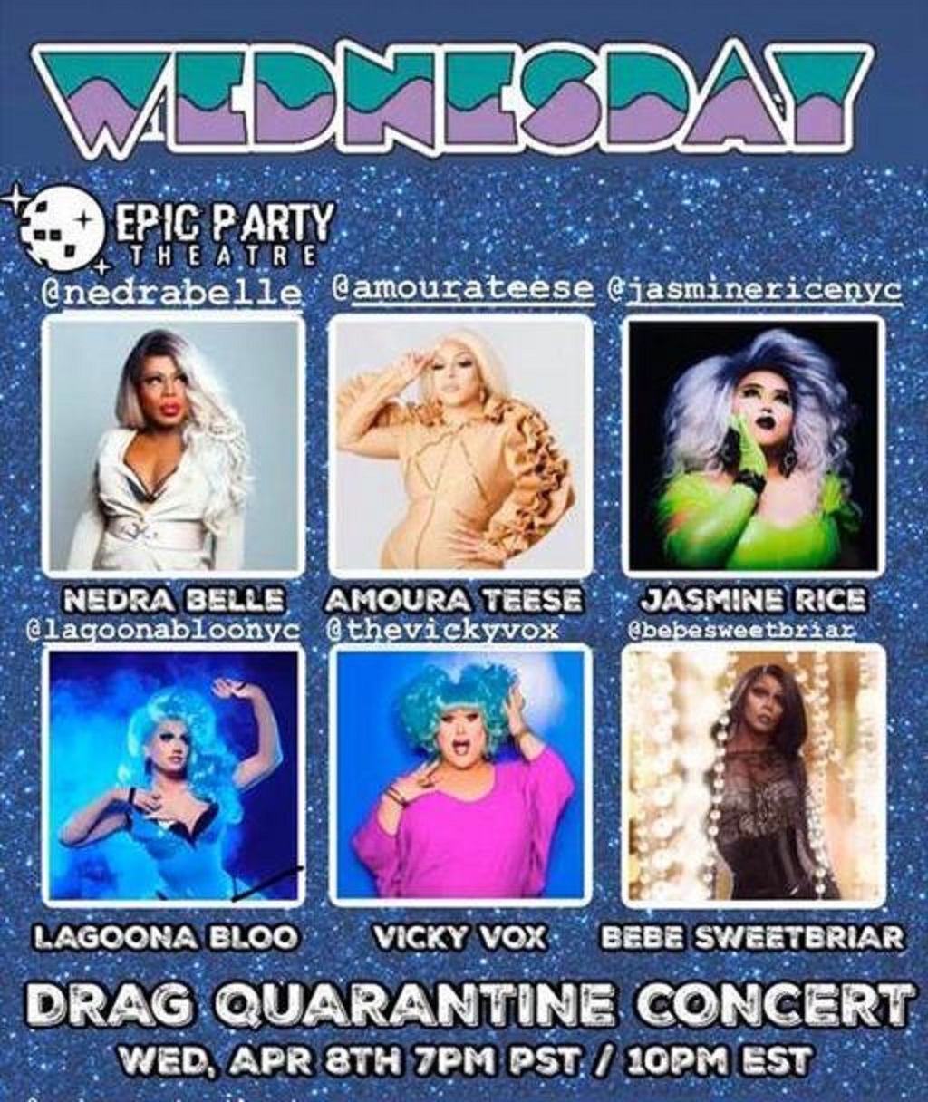 TUESDAY (4.14.2020) Your daily guide to online nightlife-based programming during the coronavirus quarantine. LIVE WEBCASTS FACEBOOK: Marti Gould Cummings (here) (3pm); Marie’s Crisis live piano bar (here) (4:30pm); Angel Elektra & Shay D’Pines (here) (6pm); Dreama Belle (here) (7pm); Long Island Gay Men’s Chorus with Alexis Flame, Annie Manildoo, Bella Noche, LaBelle, Ashley Jade & Toni Homperm (here)ContinueContinue reading “Tuesday (4.14.2020)”