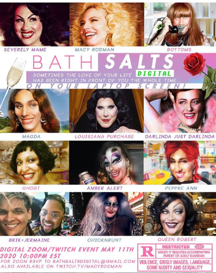 MONDAY (5.18.2020) Your daily guide to online nightlife-based programming during the coronavirus quarantine. (EST) LIVESTREAMS FACEBOOK: Marti Gould Cummings (here) (6pm); Angel South & Boxxa Vine (here) (8pm); Bingo with Miss Richfield 1981 (here) (8pm); Bella Noche (here) (9pm); Shiny Penny (here) (midnight) INSTAGRAM: Makeup with Ari Kiki & Mary Kona (here) (5pm); Dance classContinueContinue reading “Monday (5.18.2020)”