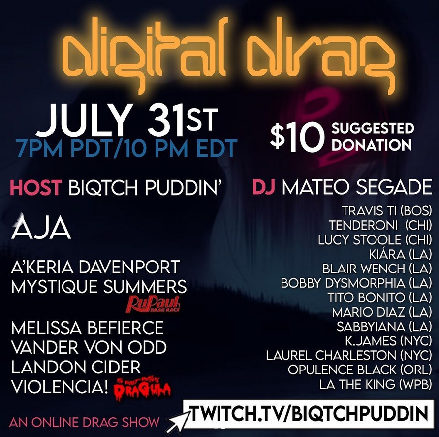 THURSDAY (7.30.2020) Your daily guide to online nightlife-based programming during the coronavirus quarantine. (EST) LIVESTREAMS FACEBOOK: Saline Dijon (here) (6pm); Princess Bitch (here) (7pm); Toni Homeperm (here) (7pm); Sparkle Monster (here) (7:30pm); Paige Turner (here) (8pm); Shequida (here) (8pm); Logan Hardcore (here) (8pm); Shirley U. Jest (here) (8pm); Bingo with Miss Richfield 1981 (here) (8pm);ContinueContinue reading “Thursday (7.30.2020)”