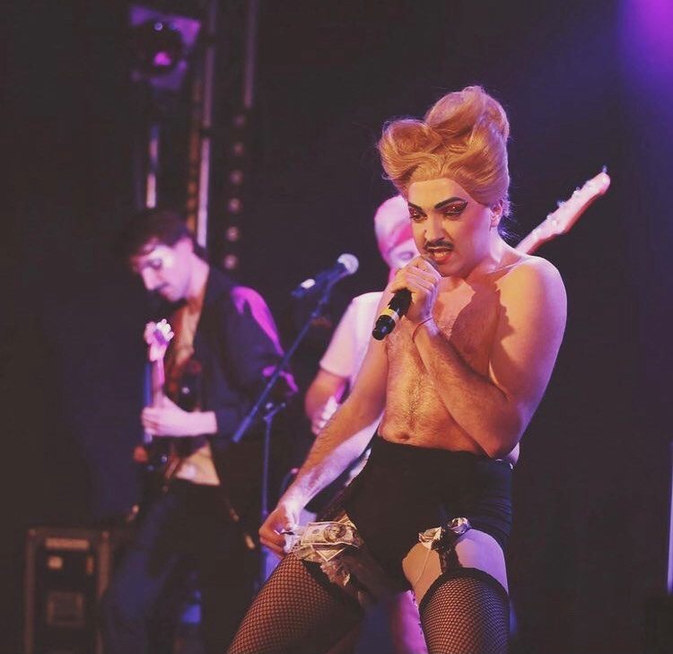 I started off as a ballet dancer, actually… but I always liked to perform, you know. Growing up I was listening to glam and pop music, and later on when I was done with the dancing I drifted to the burlesque and drag scene. From there I started to jam with bands, and sing. Then I started to write songs–it was way more rock-oriented. I was performing in every spot I could find. Once I had a mic on, I knew that music was my thing. It is to me a combination of all those elements I’ve had before.