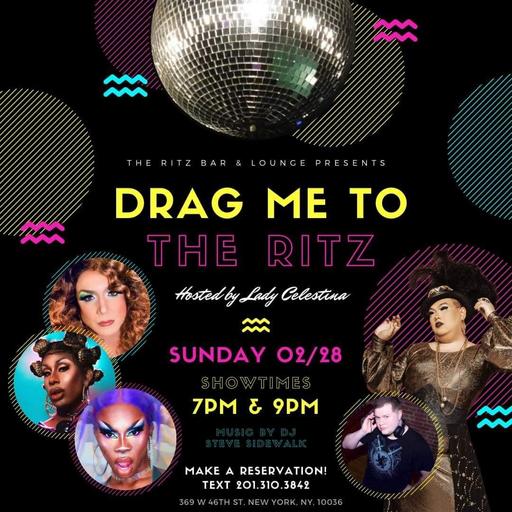 And Sunday, you’ll be back in Manhattan for Drag Me to the Ritz, hosted by another crossover Jersey Gurl: Lady Celestina! Tina Twirler and Luxx Noir London will be your fellow guest performers that night.