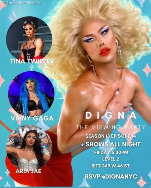 And on Friday you’ll be back with Digna–this time for her RuPaul’s Drag Race viewing party at The Ritz, along with fellow guest queens Tina Twirler and Aria Jae!