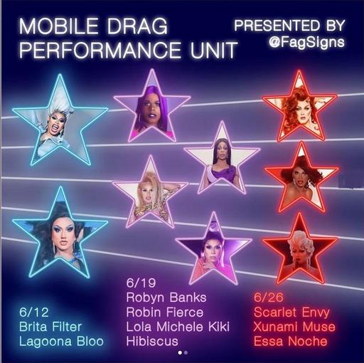 You also have a really interesting gig prior to that one. On Saturday, June 19, you’re joining queens Robyn Banks, Robin Fierce, Lola Michele-Kiki and Hibiscus for a “Mobile Drag Performance Unit,” i.e. three outdoor mini-shows around Brooklyn, sponsored by FagSigns! What can you tell us about that?