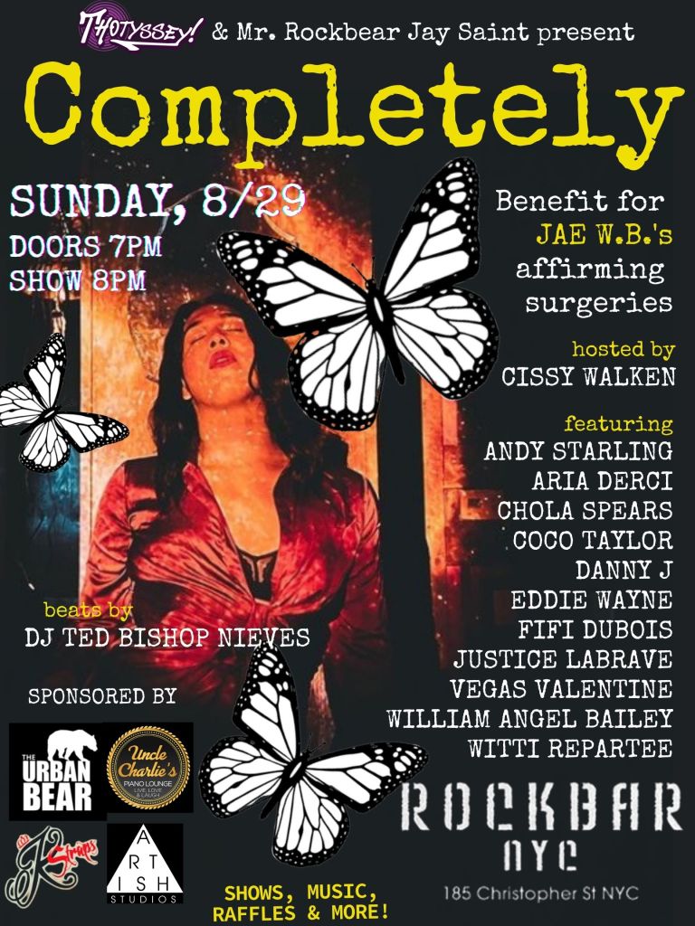 Jae’s ready for the next level of her life, and affirming surgeries and the recovery process are not easy to navigate financially. So Thotyssey is so happy to collaborate with you this coming Sunday at Rockbar for “Completely,” a benefit showcase event raising funds for her process! Jae’s good sis Cissy Walken is gonna host, many amazing nightlife all-stars will perform… how great is this gonna be?
