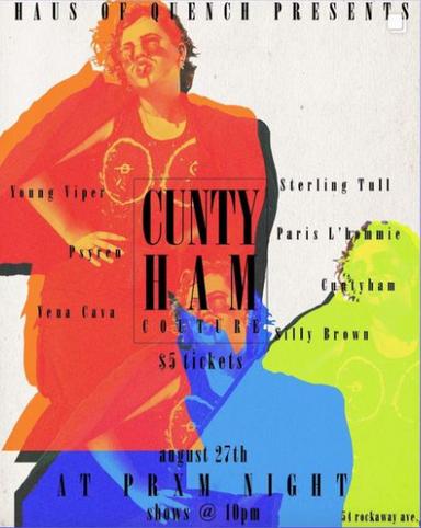 My last name is Cunningham, and I have a visceral memory of the first time I was called a cunt… which affected me in a negative way growing up. So I decided to take it back, and call myself the cunt. This character kept evolving, and I would bring it to these standup sets. This led to that, and groups of interesting queers would sneak me in to the bars of Brooklyn where I started doing Cunty as a drag character. I owe it to these trans queers, who took me under their wings and taught me the ways of nightlife.