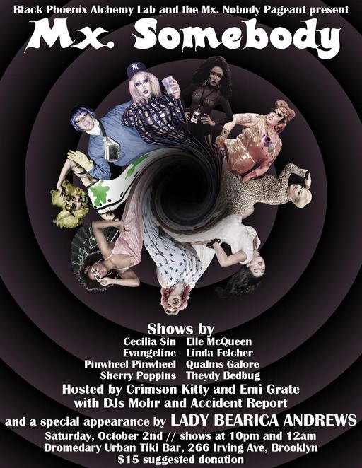 NYC’s soul remaining and active Nobody, DJ Accident Report, and Black Phoenix Alchemy Lab are bringing back the spirit of the pageant this Saturday to Brooklyn’s Dromedary Bar with “Mx Somebody,” a showcase featuring stars from previous installments of Mx Nobody! Crimson Kitty and Emi Grate will host. What else can you tell us about the show?