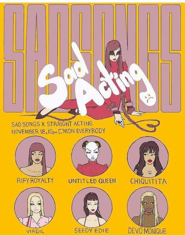 You’re going to be part of a cool show this Thursday at Brooklyn’s C’mon Everybody: “Sad Acting!” That combines two popular shows / parties: “Sad Songs,” where performers do only “emotional” numbers, and “Straight Acting,” Rify Royalty’s popular monthly!