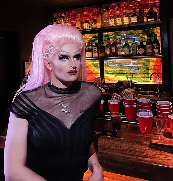 I was hired as a host at first because that was a new role they needed when the pandemic hit, and we had to start including outdoor seating as well as following socially distanced guidelines. I got the job the old-fashioned way: by sleeping with an employee at Stonewall, Paolo, who is now my fiancé. I was just starting drag at the same time, and those two worlds came together. I am now the drag host on Fridays and Saturdays, as well as a bartender in boy mode on Tuesdays.