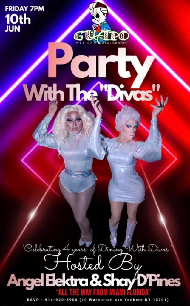I’m fortunate enough to call Guapo Mexican Cuban Cuisine in Yonkers home. I co-host “Dining with Divas” on Tuesdays with Kitty Ka’Boodlez. The show was started almost four years ago by Angel Elektra and Shay D’Pines; I think that it’s currently the longest running drag show in Westchester county. When Angel and Shay moved to South Florida this past fall, they bestowed their co-hosting responsibilities upon Kitty and me.