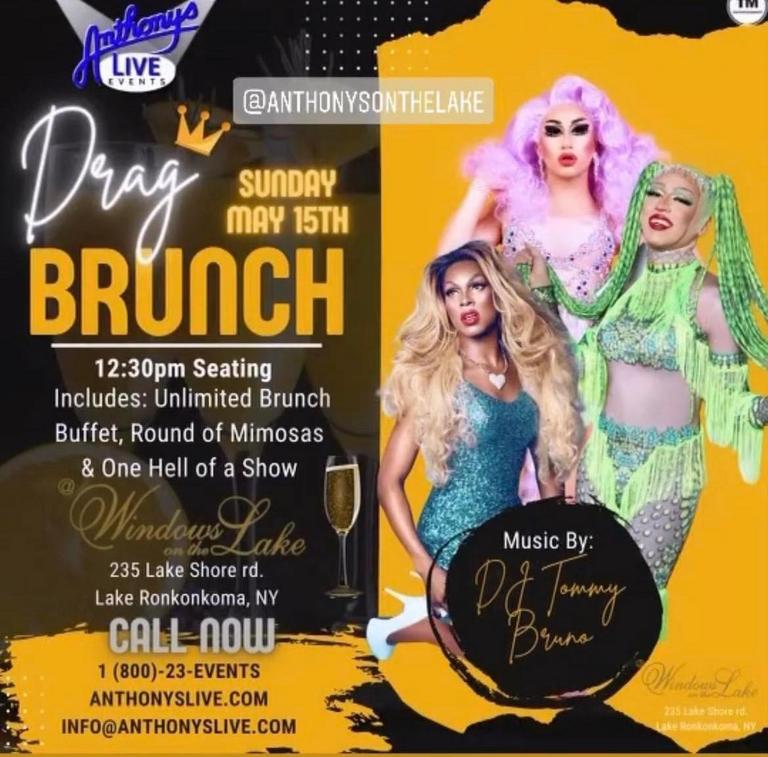 This fantastic wedding event venue is a beautiful spot along Lake Ronkonkoma. It will be our third brunch with them, and it’s mostly Long Island women who love to brunch with gorgeous drag queens. We are promoting non-stop to bring out more of the queer community to a non-queer event establishment; we started to print out flyers and post them around the malls in the surrounding areas in Long Island. It’s a fabulous drag brunch that offers group ticket sales that include delicious gourmet buffets and unlimited mimosas with a full bar available. It’s been Ruby Slay Monroe and myself, with special guests every brunch we do. We have the famous DJ Tommy Bruno on the beats and mic. We play games too, and have a great time with a fabulous view of the lake in the background for the perfect photo opportunity.