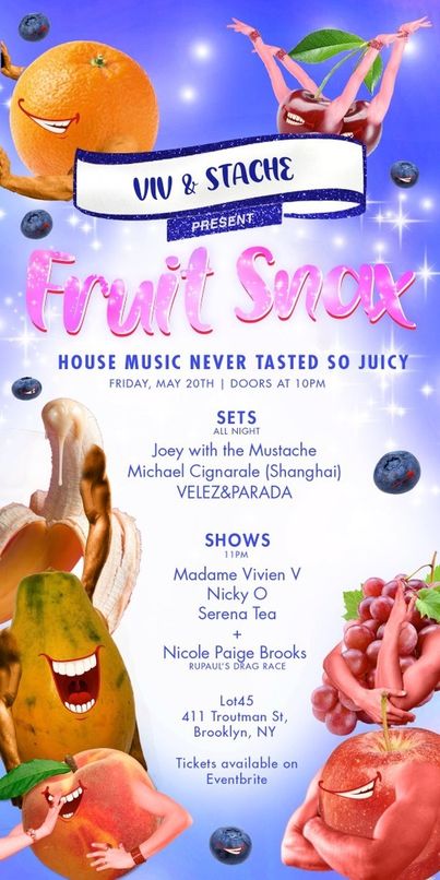 You and your sis Madame Vivien V have presented us with a number of fun events in recent months, including the dance party-meets-drag show “Fruit Snax!” The next one will be at Lot45 in Brooklyn on Friday, May 20th.