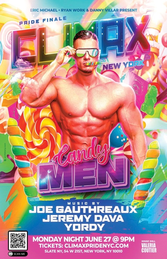 at our MONDAY NIGHT PRIDE FINALE event: CLIMAX CANDY MEN featuring the long awaited NYC return of DJ Joe Gauthreaux! And experience the Big Apple