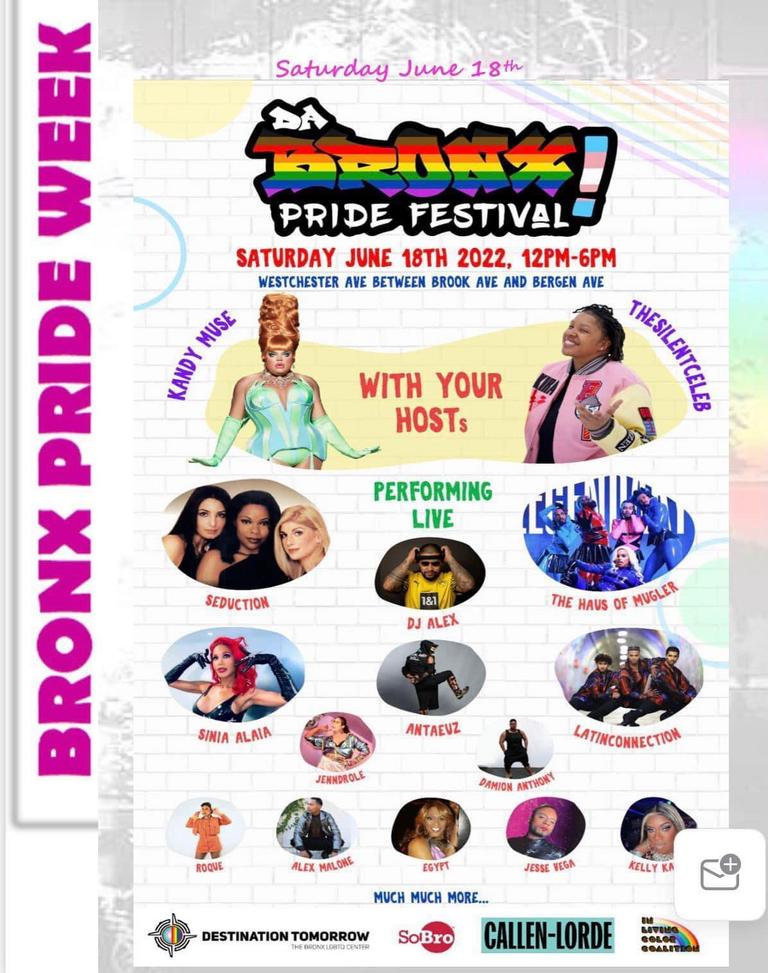 SATURDAY (6.18.2022) Your daily guide to New York queer nightlife. UPTOWN / BRONX WESTCHESTER & BERGEN AVES: Bronx Pride feat. Kandy Muse & TheSilentCeleb host the Bronx Pride festival featuring Seduction, The Haus of Mugler, Sinia Alaia, Anteauz, LatinoConnection, Jenn D’Role, Damion Anthony, Roqué, Egyptt LaBeija, Kelly KaBoom, Jesse Vega & Alex Malone (noon)CHOCOBAR CORTES: Brunch feat. Jacqueline DupreeContinueContinue reading “Saturday (6.18.2022)”