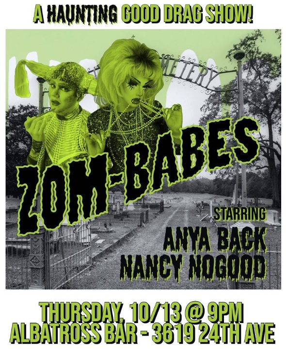 We’ll get to see you a few more times before Halloween–starting with “Zom-Babes,” an October 13th (Thursday) show at Albatross co-starring Nancy NoGood.