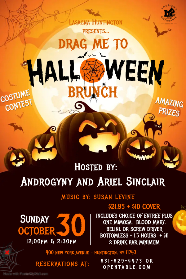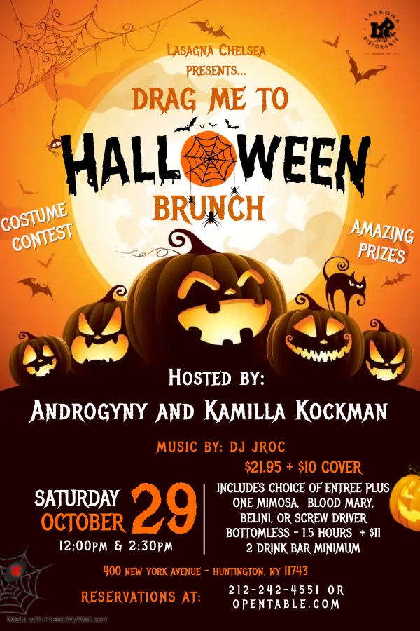 Are you ready to get Spooky?!?!?! Join us for “Drag Me To Halloween Brunch” at one of our two amazing locations. Saturday October 29th in Chelsea NYC hosted by Androgyny with special guest Kamilla Kockman or Sunday October 30th in Huntington, NY hosted by Androgyny with special guest Ariel Sinclair. Both seatings are at 12:00pm and 2:30. Reservations HIGHLY suggested at Opentable.com. Not only will we be giving you a Spook-tacular show but we will be having costume contest! Come in your best Halloween costumes and win some AWESOME prizes! Reserve now in Chelsea and / or Huntington!