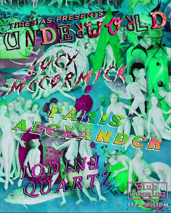 I’m gonna be at Club Cumming for Tiresias‘ “Underworld” show on November 2nd (at 11pm) My grandma had a band called Dmoja with some songs about invoking spirits, and I think I’m going talk about her and perform / lip sync to a track on the album that I haven’t released yet. It’s called “Banda” and its a plea for Papa Legba to open the gates to the spirit world. And November 19th, I’m gonna do a new performance piece–probably involving a microphone–at Grace Exhibition Space for a series Nile Harris curated.