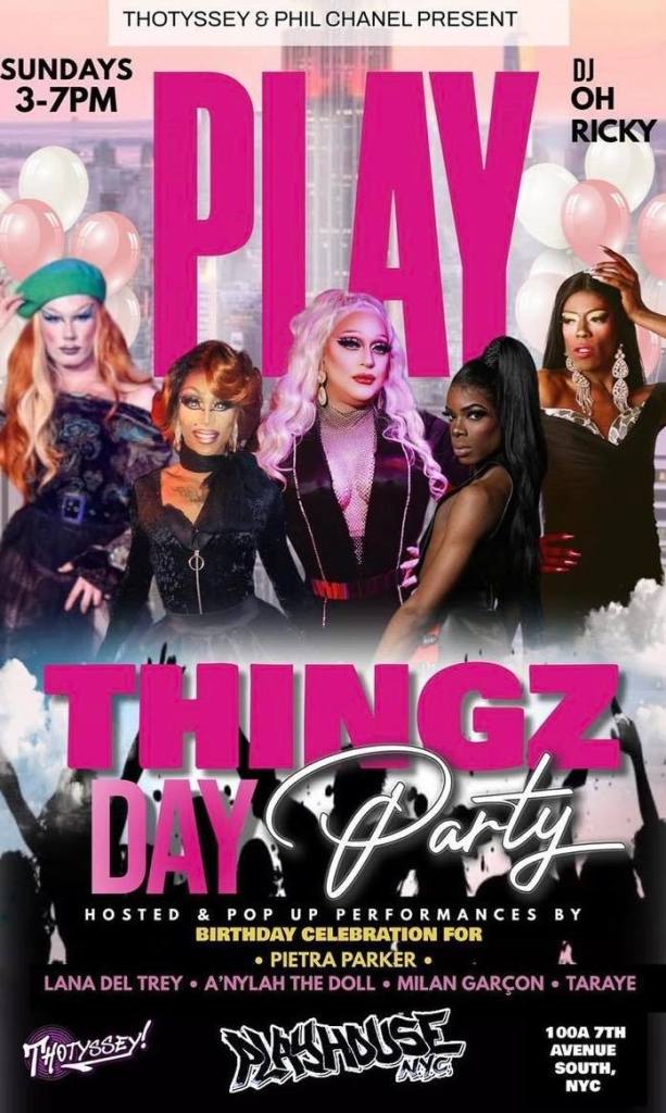 Lucie Screws & Ronda Vu (8pm) - PLAYHOUSE: Thotyssey & Phil Chanel’s “Playthingz” feat. Pietra Parker with A’Nylah The Doll, Lana Del Trey, Milan Garçon, Taraye & VJ OhRicky plus NeKeith (3pm);