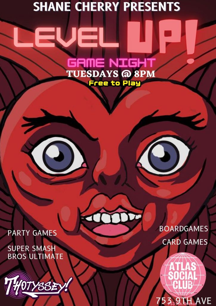 - ATLAS SOCIAL CLUB: “Level Up” geeky name night hosted by Thotyssey & Shane Cherry (8pm)