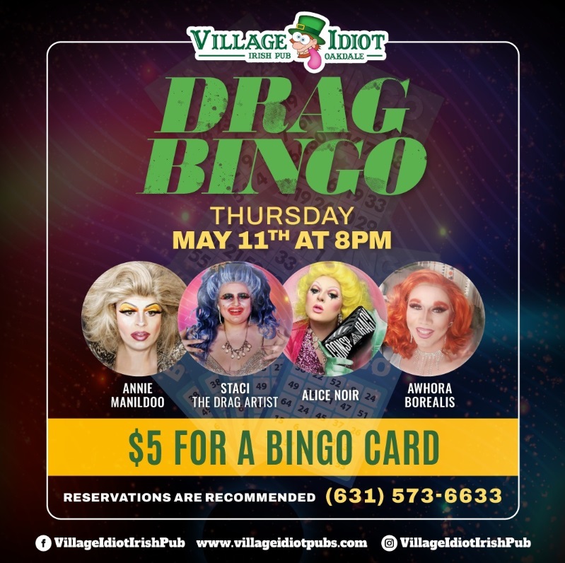 Then I see that Thursday, May 11, you and many queens from this same cast will be back for another LI event… this time, drag bingo at the Village Idiot Pub in Oakdale!