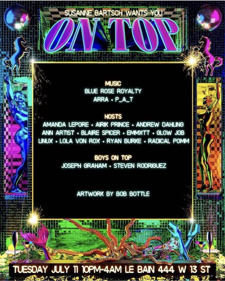 - LE BAIN / THE STANDARD: Susanne Bartsch’s “On Top” feat. DJs Blue Rose Royalty, ARRA & P_A_T (10pm)