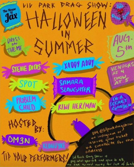 I’ll be performing at Lil Park Drag Show for “Halloween in the Summer.”