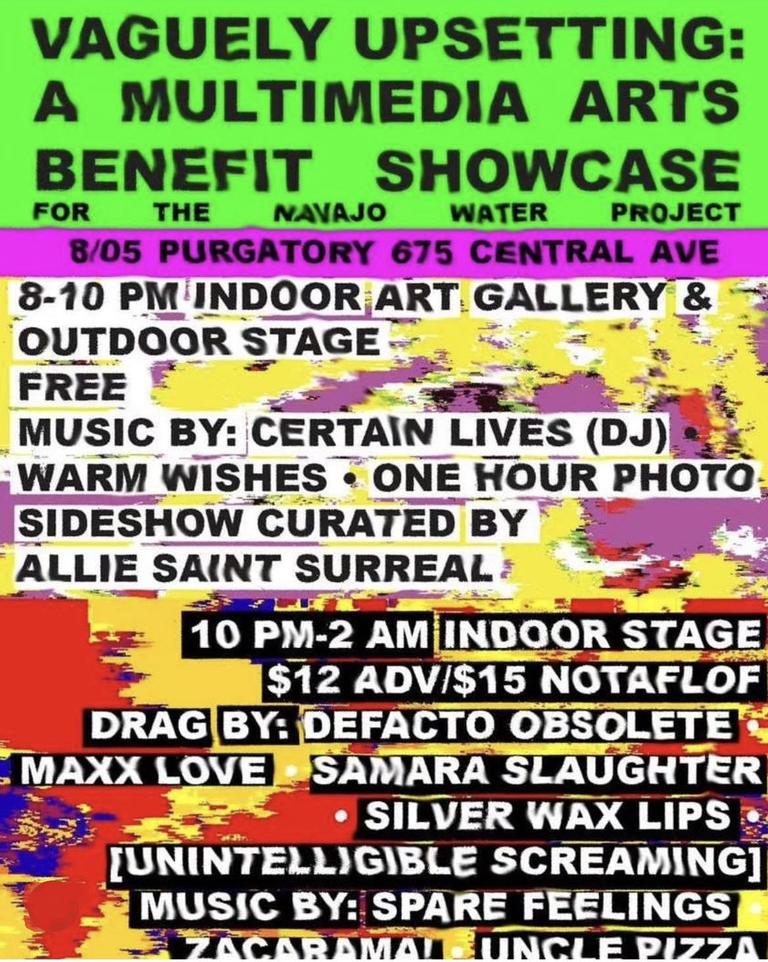 It’s a benefit showcase raising funds for the Navajo Water Project and the theme of the night is “Vaguely Upsetting.” There’ll be an indoor art gallery, acoustic sets, drag and a sideshow–it’s gonna be a lot in all the best ways.