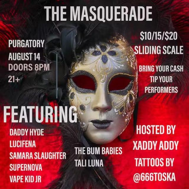 And then on the 14th, you’ll be at Purgatory once again… this time performing at a party that Xaddy Addy is hosting there: “The Masquarade.” That looks fun!