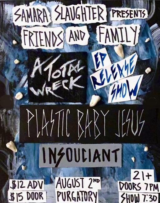 I host and perform alongside my favorite bands in the scene, and this Wednesday we’re highlighting A Total Wreck and their EP release, with Insouciant and Plastic Baby Jesus. I’ll be the frightening host screaming your ears off; the bands will melt your faces. And if you’re still looking for something to do after that, “Whoopsie Wednesday” is right after.
