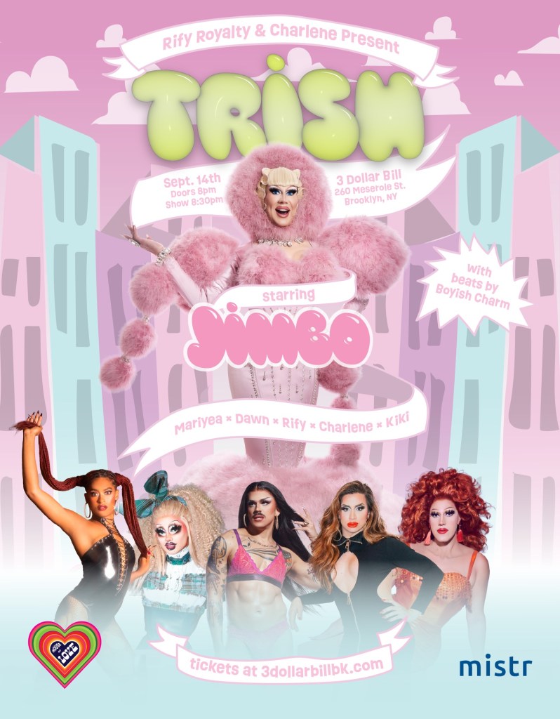 You’ll be back at Brooklyn’s 3 Dollar Bill for “TRISH,” hosted by Rify Royalty and Charlene! That’s this Thursday, September 14 at 8pm. Local girls Mariyea, Kiki Ball-Change and Dawn will be there as well.