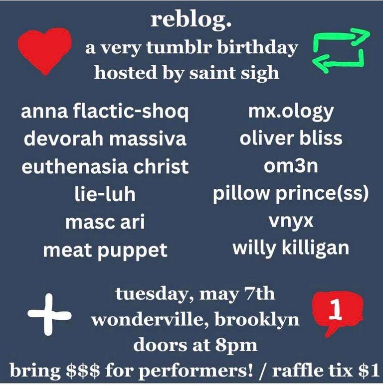 Lets talk about some shows! First off, this Tuesday you’ll be part of “Reblog,” Saint Sigh’s “very Tumblr birthday” show at Wonderville! That should be fun, right?