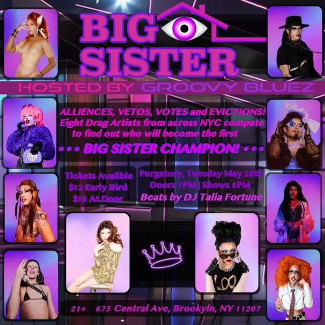 Looking ahead to Tuesday, May 28th, you’ll be part of the cast of a new competition “Big Sister” hosted by Groovy Bluez at Purgatory which promises to include some favorite reality TV tropes like wine throwing levels of drama and alliance formation! What’s this all about?