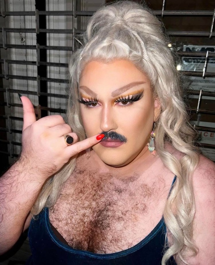 I often times like to be a hyper femme version of drag, but with the mustache and chest hair added–which can really mess with people’s conception of drag. But also, there are lots of people who identify as women with body hair… so I don’t think being hairless should be any sort of requirement for drag.