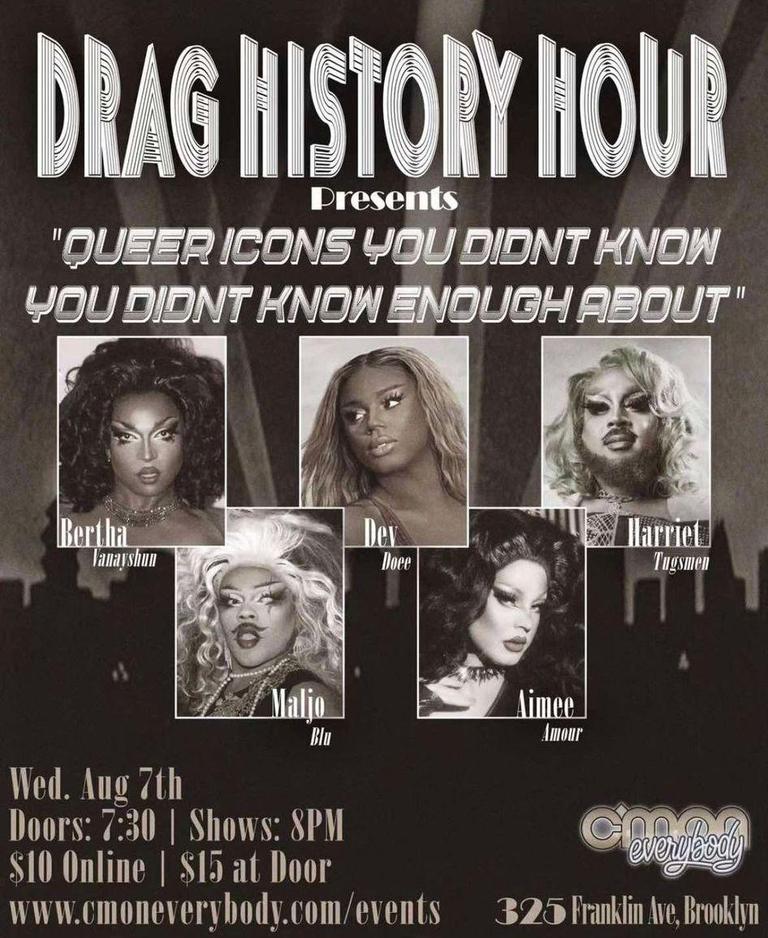 Folks have a few upcoming chances to see you perform amongst other Brooklyn drag greats, starting with Wednesday, August 7 at C’mon Everybody: “Drag History Hour,” celebrating queer icons!
