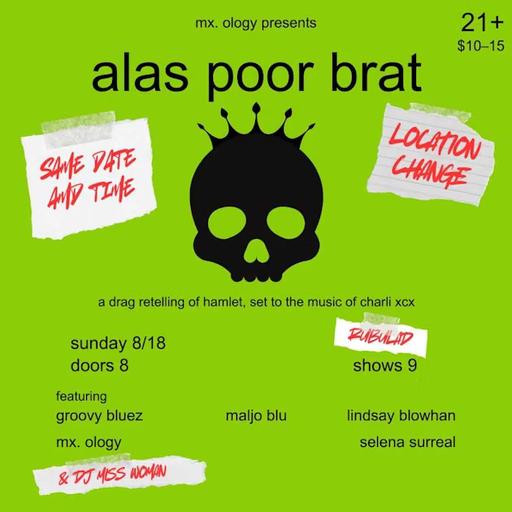 Blood and bagels! Well, this Sunday, you might have a whole new favorite event to add to the list. You’ll be at Rubulad as part of a drag rendition of Shakespeare’s Hamlet, “Alas Poor Brat,” hosted by Mx. Ology! How’s this gonna work?