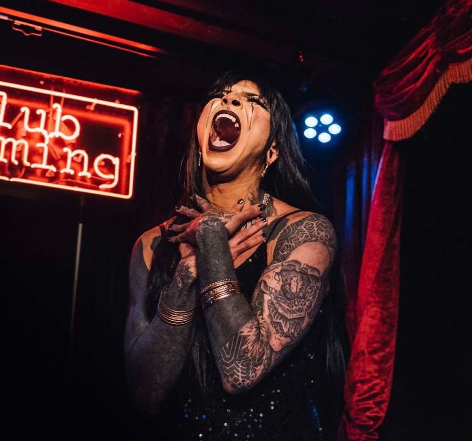 From there, I started helping out around Disasterpiece Theater, a circus sideshow variety show that ran monthly at Bizarre Bar and then The Deep End pre-Covid, as well as doing live play-piercing demos with my dear friends Jin and Gia at various parties and fetish events. Right before shutdown, I really started focusing primarily on doing sideshow… which evolved into the drag I do now!