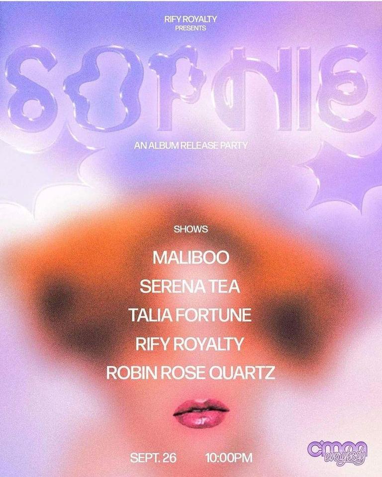 You are celebrating another trans music icon, the late great SOPHIE, for two consecutive days near the end of the month, around the same time her fans will be enjoying a newly released collection of music. First up is Rify Royalty’s “Sophie” at C’mon on September 26.