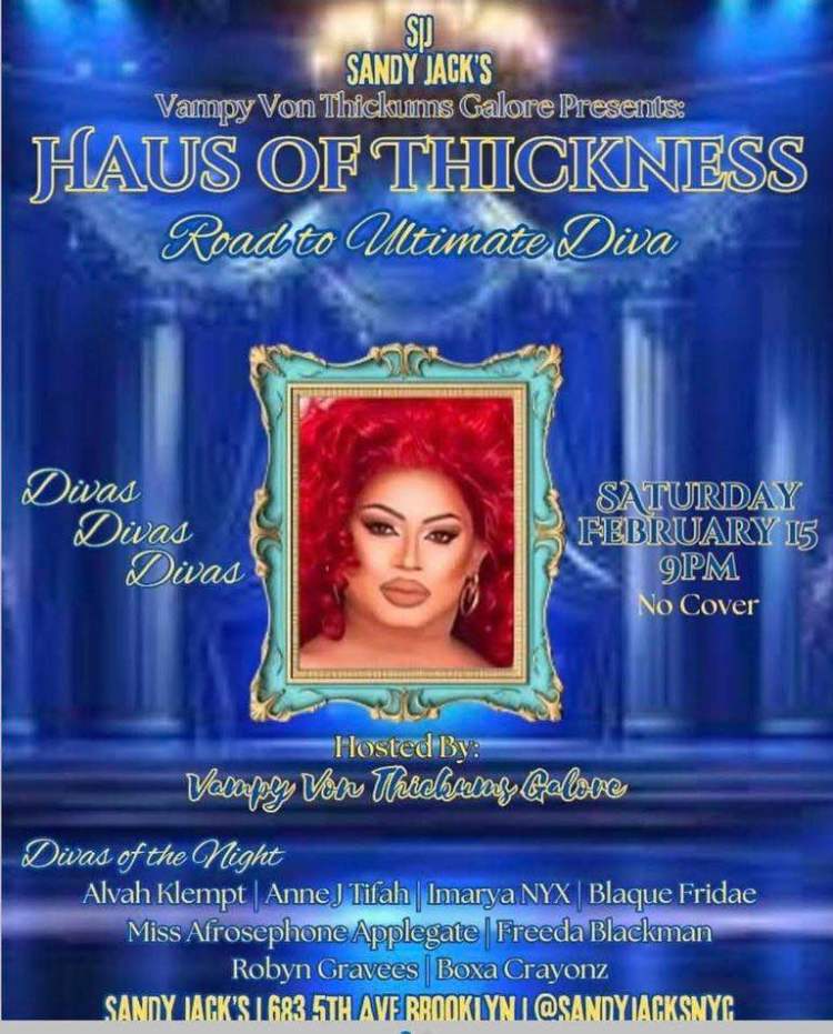 Speaking of Sandy, you have some shows coming up there! First is this Saturday’s “Haus of Thickness” hosted by Vampy Von Thickums Galore! That’s your sis, right?