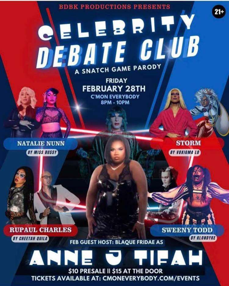 And on the 28th, you’ll be guest hosting an improv drag comedy show “Celebrity Debate Club,” inspired by Drag Race’s “Snatch Game,” at C’mon Everybody!