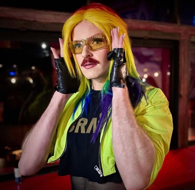 My drag is really joyful and theatrical. I try to sing live every performance. I love to improvise with the audience, and use every bar as my playground.