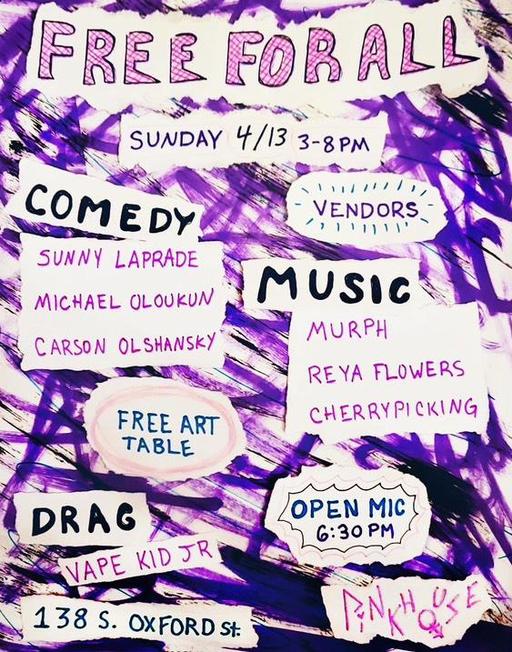 In the meantime, I’ve got two upcoming shows I’m excited about: “Free For All” on April 13th–free art, comedy, and music, with an open stage. For anyone interested, DM PINKHQUSE.