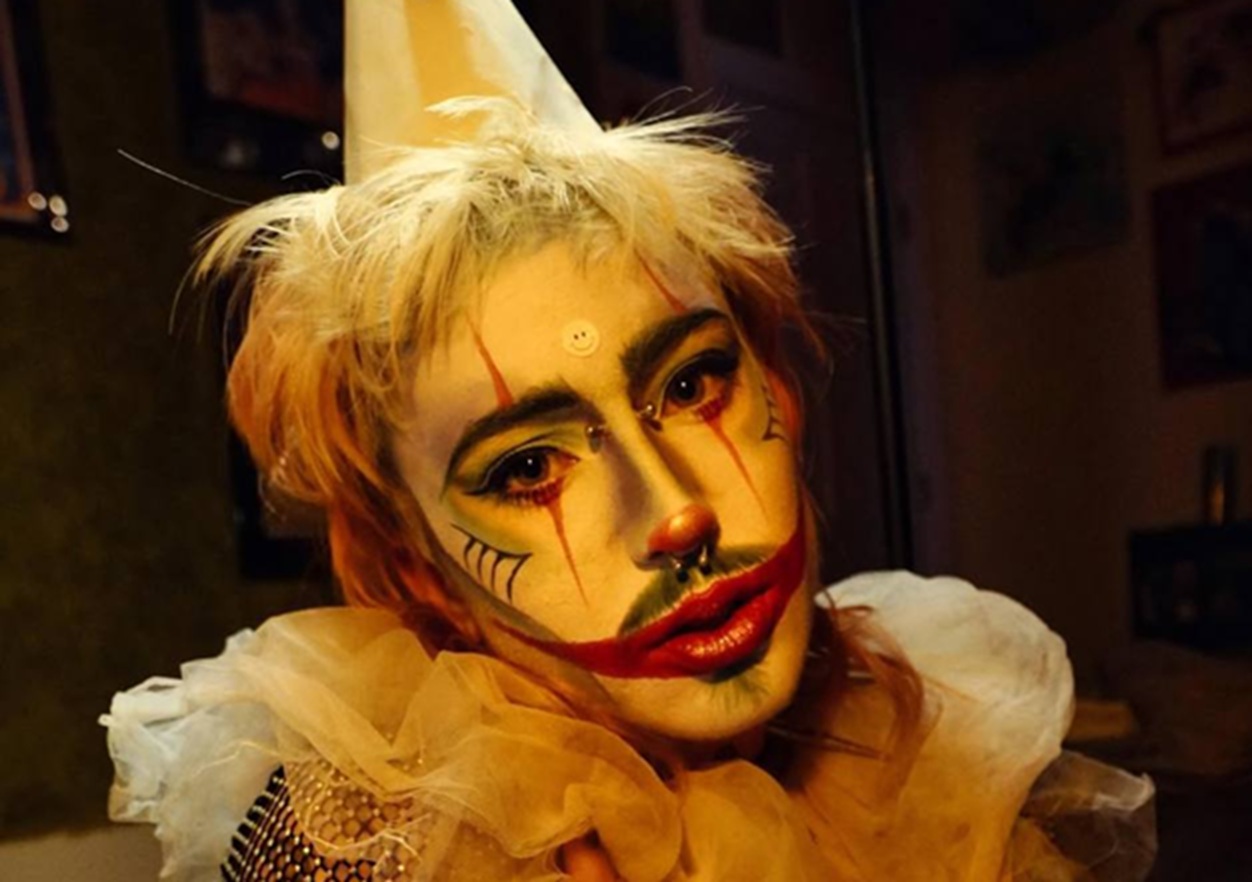 A full clown face was something I had always been drawn to, especially as I began to understand more about my identity as a trans queer person. But it wasn’t until I broke my foot in 2022 that I actually took the time to sit down and start playing with makeup and the inspiration of clowns. I made a lot of TikToks–at that time I only ever did my makeup for myself, to make videos. I only existed as a clown in my bedroom (and online).