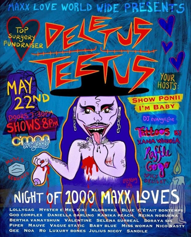 Then on May 22nd, it’s a big night. Your BF Maxx Love’s top surgery benefit showcase will be at C’mon Everybody: “Deletus Teetus” (ha!) hosted by ShowPonii and I’m Baby, and featuring a large and talented cast including yourself!