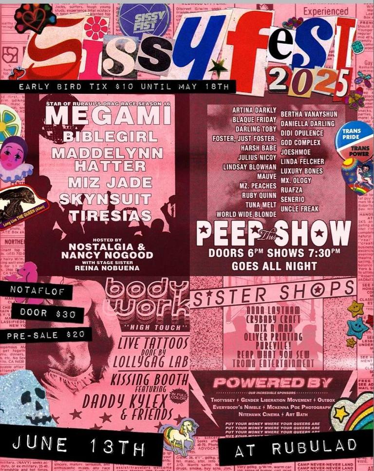 And this just in: on June 13th you’ll be tattooing the children during “Sissyfest 2025” at Rubulad, which will have an epic lineup of performers onstage!