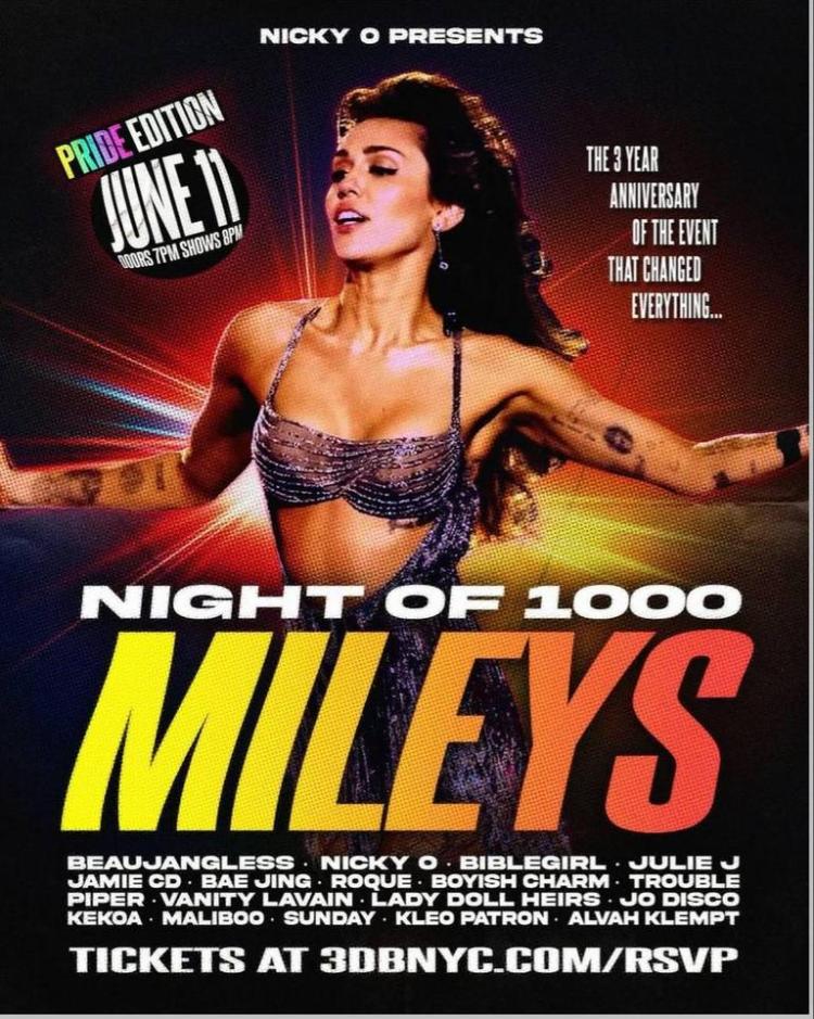 You can show off those moves and looks on Wednesday, when you will join the cast of “Night of 1000 Mileys” on the 3 Dollar Bill stage! How do you like her new music, by the way… and were you mad at her for showing up at that other 3DB Miley night, lol?