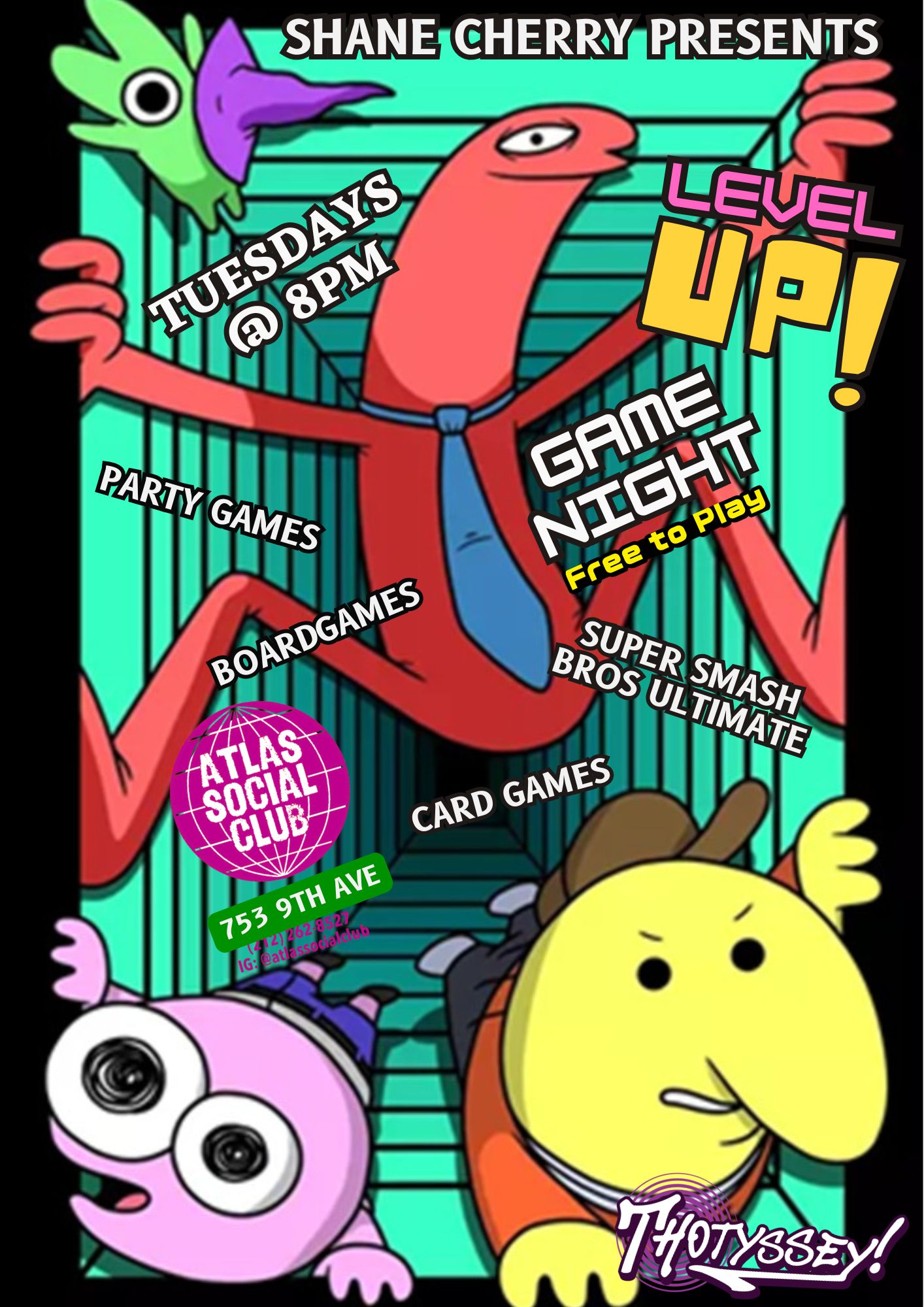 - ATLAS SOCIAL CLUB: “Level Up” geeky name night hosted by Thotyssey & Shane Cherry (8pm)