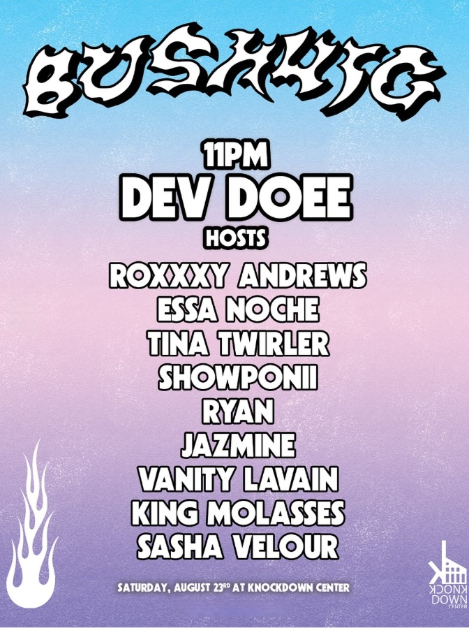 You’ll be taking part in one of the world’s best known drag festivals on Saturday, August 23rd at the Knockdown Center… Bushwig! I suspect this isn’t your first Bushwig, but how excited are you!? Drag Race icon Roxxxy Andrews and your KoD judge Sasha Velour will be headlining, alongside tons of local and visiting queens and kings and things!