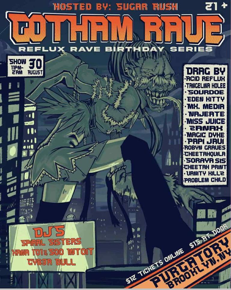 It’s been my dream to have a full out nerd production. As a child, I always grew up with super heroes and villains… it’s heavy inspiration for my drag as well. I wanted to throw a Gotham themed rave for my 24th birthday because I saw Acid Reflux as a super villain in that universe — hence the inspiration of the flyer. I wanted to see everyone’s creative takes on the Gotham characters. It wouldn’t be a Reflux Rave without some sickening DJs as well. I wanted to recreate the club scenes from the Gotham animated series, but make it queer / trans!
